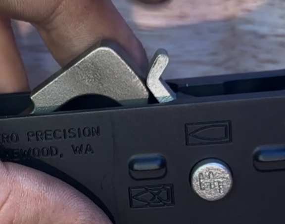 Pushing it all the way to the right is the “semi-auto” position and the firearm will function as usual and the trigger is not “forced” to reset. If the button is pushed halfway to the right, this is the “forced reset” mode and the gun will force-fire repeatedly in an action similar to full-auto. However, the trigger is being reset each time and only one shot is fired for every pull of the trigger.